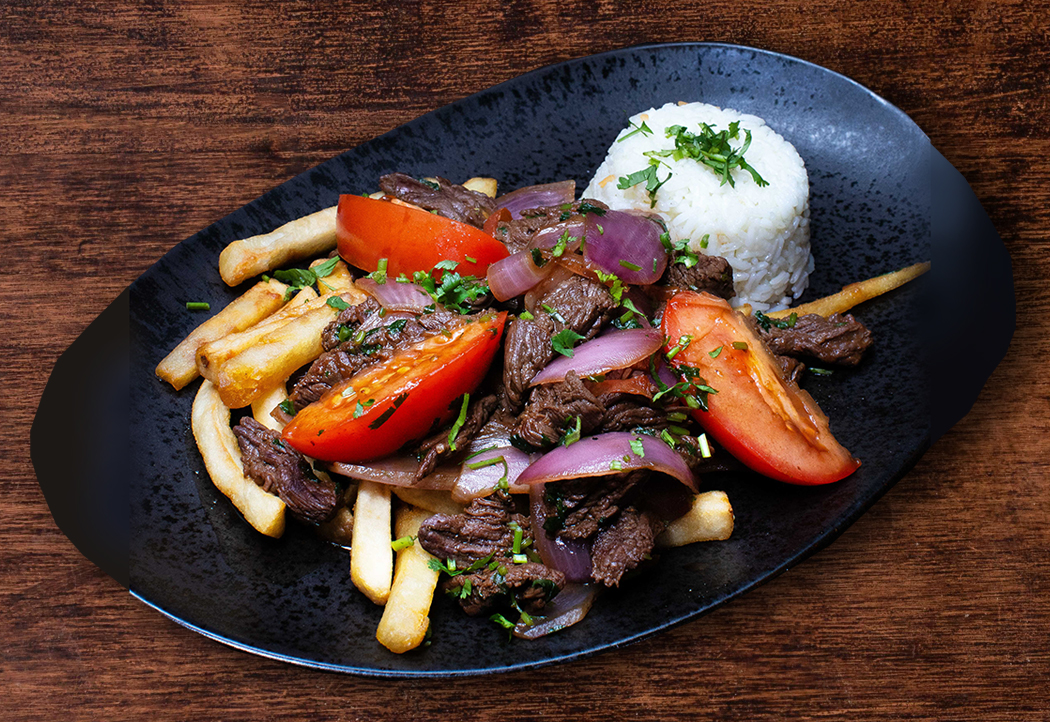 Tender steak served over a bed of white rice, with plantains, fries and sunny side up egg.
