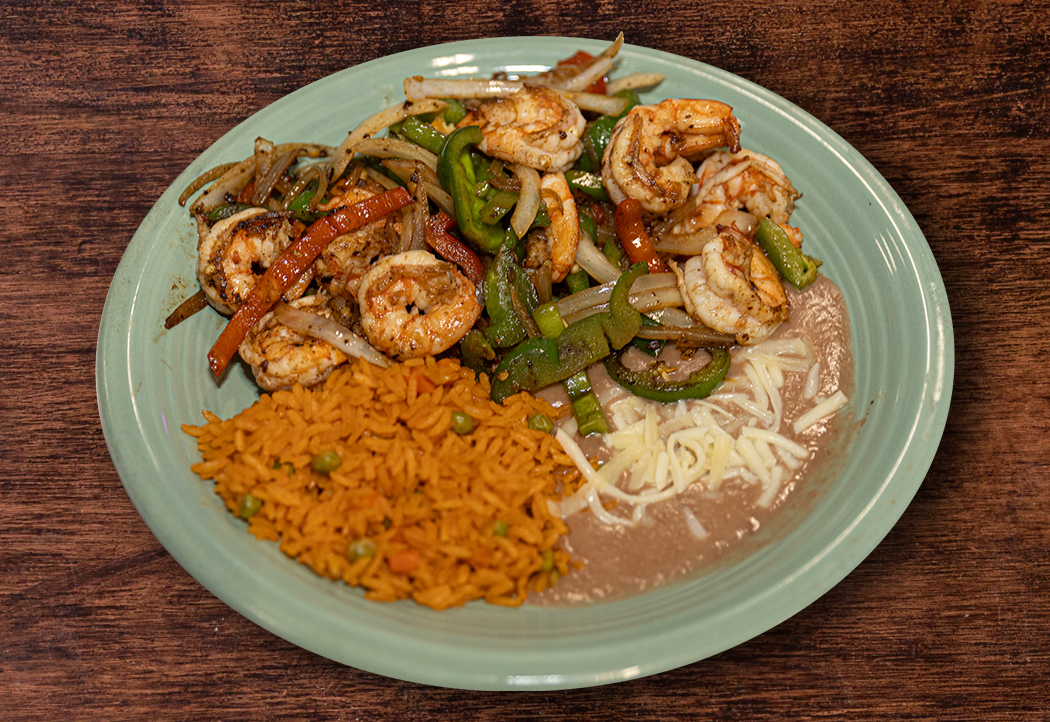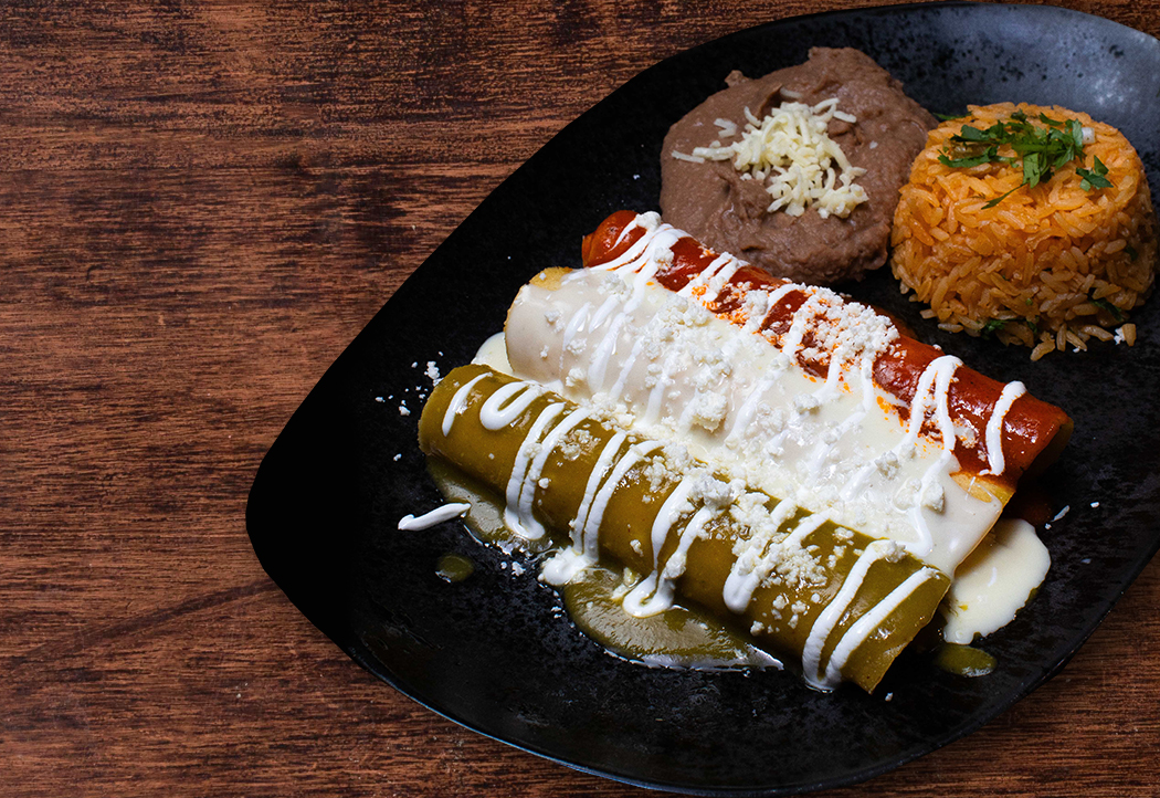 Three chicken enchiladas covered with green sauce, queso, and house enchilada sauce. Served with a side of rice and beans.